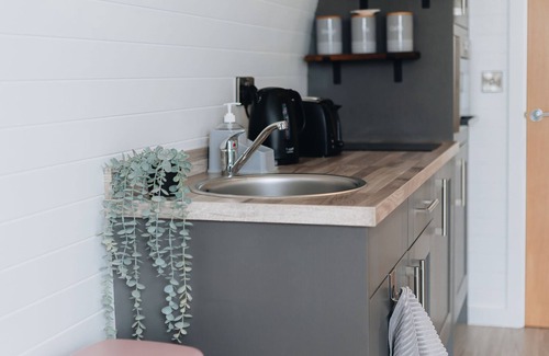 Step inside to find a stylish open-plan living and kitchen area, decorated in calming tones of grey and soft pink. The kitchenette is fully equipped with a microwave, two-ring hob, fridge, toaster, and kettle—plus a round dining table with seating for four, perfect for mealtimes together.