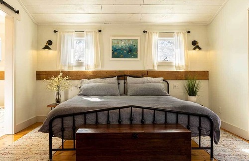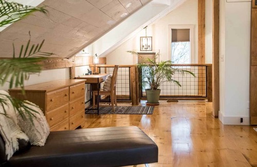 The uncluttered interior is luxuriously furnished and comfortably sleeps 4. The downstairs bedroom has a queen size bed (Leesa Hybrid mattress), tucked under exposed beams, making it an incredibly cozy place to retire. The oversized master suite is the entire 2nd floor with loads of space for a king size bed (Leesa Hybrid mattress), on-suite bath, chaise lounge and desk/work area. Additionally, there is a wonderfully inviting single twin bed (premium memory foam mattress), under the stairway – great for kids, or even a single adult. All beds have super-soft, linen sheets and comforter covers.