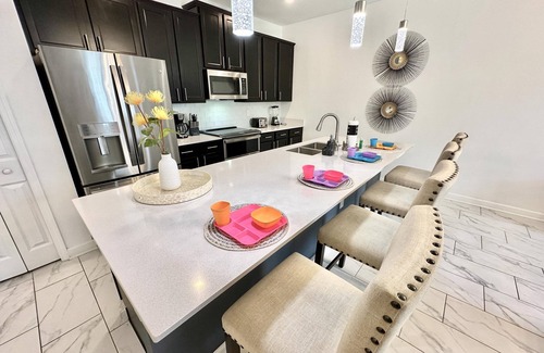 Enjoy this beautiful townhome with cozy decor at Champions Gate. It is one of the best Resorts in the region. The Club House is just an 8-minute walk from the house. Here you will have a beautiful space with everything you need to spend a vacation with your family. This house has a private Splash Pool that receives the afternoon sun to relax and unwind.