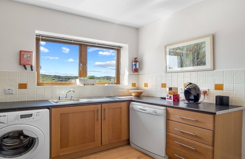 Semi open plan reception, kitchen and dining area. Fully fitted kitchen with all mod-cons, electric oven and hob, dishwasher, microwave, washing machine with combined drier. From the large kitchen window you have a panoramic view of the Connemara Pony Show grounds and the Owenglen river.