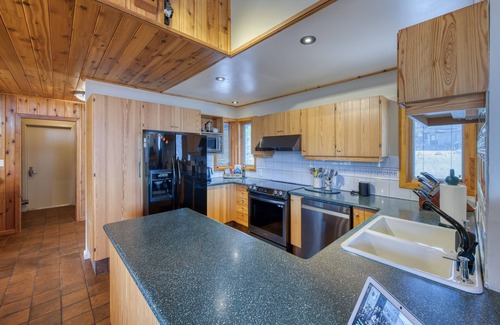 The main level features an open concept kitchen leading to the raised Great Room with double-sided wood fireplace & floor to (vaulted) ceiling windows - providing lots of natural light. There are board games for all the family along with an eclectic book collection and high-quality Bluetooth home sound system. Gather everyone for family meals around one of two dining tables.