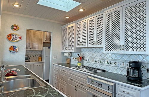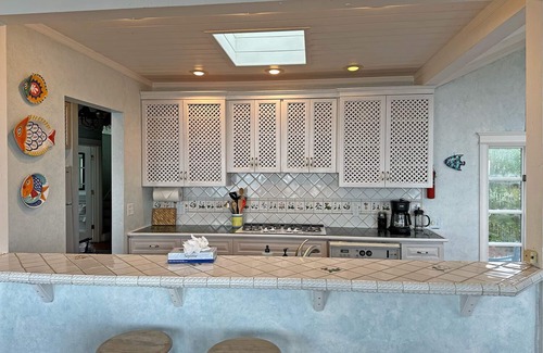 Cook a holiday meal in the convection oven and/or the gas range while you watch the tide roll in and out. The dining room is one my favorite spots in the cottage since it offers views of both the garden and the ocean. Close off the den from the rest of the house and enjoy a good book or take a nap on the comfy couch. The loft has a queen bed with a sky-light and views of the ocean and hilly ranch land to the east. Master Suite has a king bed with french doors opening out to the front garden courtyard. This unique ocean-front property is a 10-minute walk to the beach.