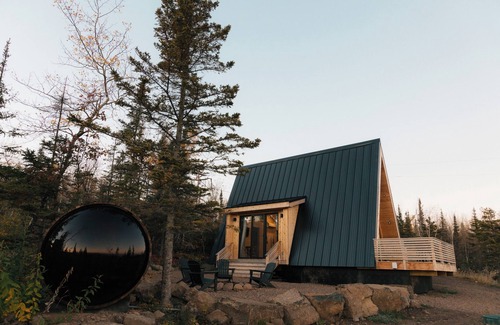 Retreat to our one-of-a-kind A-frame overlooking Lake Superior! Enjoy watching the sunrise through a wall of windows, panoramic barrel sauna, heated floors, custom kitchen, and full bath. The private outdoor setting includes a deck, campfire, grill, and more.