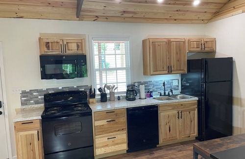 The Cliffside Hideaway is a new custom cabin with water view,3 boat ramps within 2 miles, golf cart ride/walk to 5 restaurants, storesand liquor store. All new appliances including a dishwasher and everything you need for a getaway! 2 king size beds plus the sofa is a new queen sleeper. Tankless hot water heater so long shower is waiting after a day in the lake and won’t run out of hot water. Huge boat parking area with fire pit stocked with wood and charcoal grill.