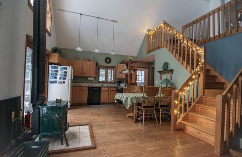 In the winter, the home can be heated with a glass-front wood stove. Firewood is supplied for our winter guest's heating comfort. The driveway travels about 200 yards in from the main road and is well plowed with plenty of parking. If you'd rather not heat with a wood stove, the electric baseboard heat is always available.