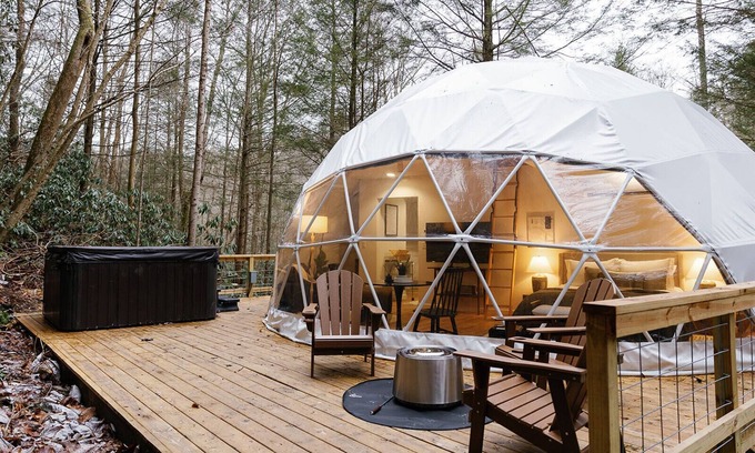 A rare, elevated stay in Red River Gorge, this property offers the perfect setting for an upscale glamping experience. This newly-built dome combines modern design with earthy textures- giving you a "home sweet home" type feeling. Bring your crew over the river and through the woods to our 26-acres of woodlands, with free access to Spirit Lake. Located 15 mins. from Natural Bridge State Park in Daniel Boone Nat. Forest. Come hike, climb, and explore the good ole' outdoors! *4WD VEHICLES REQUIRED*