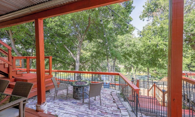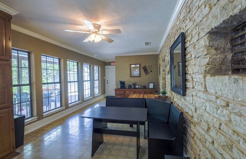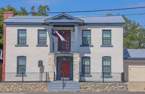 Take a step back into the late 1800s while enjoying comfortable, modern accommodations with this historic home. Originally used as the first Bell County Jail offering spectacular views of Nolan Creek and direct creek access! Constructed in 1873 and featuring the original jail bar windows, the home was built out of solid limestone bricks and still has exposed limestone throughout the home. We have all that you will need for a cozy getaway in the heart of Downtown Belton. At almost 2500 square feet you will have plenty of room to make yourself right at home. There are 3 bedrooms upstairs with 1 king, 1 queen and 2 sets of bunk beds. There is also a full-size desk with office chair in the guest bedroom that overlooks the creek. There is one full bathroom upstairs with a tub which is located in the master and another full bathroom located on the first floor with a shower. This home offers direct access to Nolan Creek, a large covered deck and covered balcony overlooking your private backyard oasis. Located directly across the creek from Yettie Polk Park which features a 3-mile paved walking trail, splash pad, playgrounds, and basketball courts. Permit# 23-10059