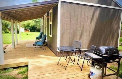 Cabin #1 is close to downtown and provides easy access to restaurants, entertainment and businesses. However, it sits on a peaceful 1 acre lot along side cabin #2 with room for boats and trailers. It has a gas grill, fire pit, outdoor dining table and chairs, and a covered front porch to enjoy the tranquil setting.