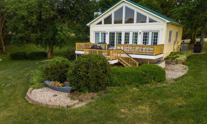 Cozy little lakeside cottage with AMAZING views of beautiful Clinton lake. Set on the front deck and listen to all the sounds of nature while watching all the activity on the lake!! What a great place to unwind. Serene and private setting. This peaceful country property will allow you to unwind and forget about all your worries of everyday life. Custom kitchen cabinets with quartz counter tops and an island large enough to seat 12. The kitchen is the front of the cottage so everyone can enjoy the view while cooking, dining or playing games. One bedroom and bathroom are found on main level and the remaining beds andsecond bedroomsre found in the walkout basement. This cottage is one you will book again and again.