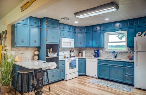 The outside offers BEAUTIFUL sunsets, covered outdoor dining for your whole party, grilling area, firepit, and a cute little outdoor reading "nook" and a extra large back yard. Plenty of parking for multiple boats. Near by bait and tackle shops and wood for purchase for your evening fires. No parties please!