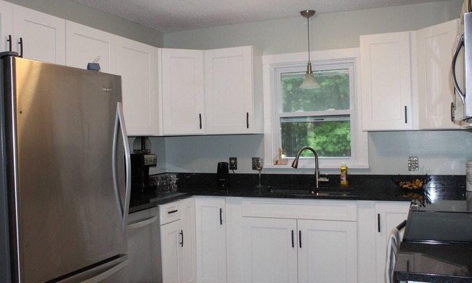 Cape Style Home, with air conditioning, that has been freshly painted throughout with brand new kitchen and granite countertops. Two living rooms with a gas fireplace in one of them. Freshly painted deck off the living room with above ground pool. Walk from living room to pool within two steps. There are two bedrooms upstairs (One has queen sized bed and the other has full sized bed) , along with a partially finished basement which has a big bedroom with a queen sized bed and big closet. There are beautiful gardens and a private backyard.