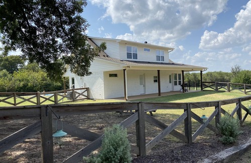 Perfect stay for a family or friend getaway! A little vacation all by itself with a Pickelball Court, Beautiful 3 bedroom home with a loft is surrounded by tall trees and countryside, a beautiful Barn with a minature donkey and goat, Ping Pong table, Corn Hole, fully stocked kitchen & outdoor BBQ for fun meals at the house!
