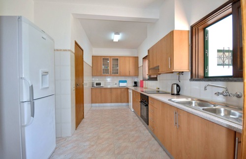 Step inside to an open plan living and dining area, where natural wood furnishings, whitewashed walls, and traditional tiled floors create a cozy, rustic charm. The fully equipped kitchen has everything needed for home-cooked meals, while four spacious bedrooms (two doubles and two twins) ensure comfort for all. With three bathrooms (one ensuite), air-conditioned bedrooms, and two sofa beds in the lounge, the villa effortlessly accommodates large groups or families.