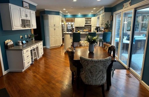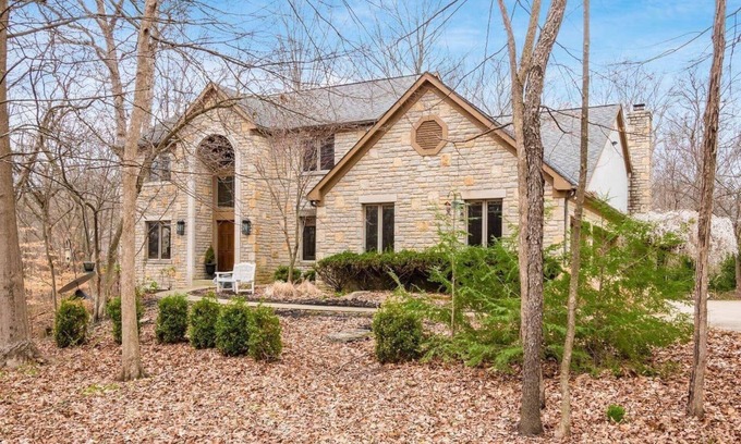 Relax with the whole family at our secluded, wooded home nestled in an exclusive, walkable neighborhood. Enjoy the hot tub, in ground, heated pool as well as two outdoor seating areas. The lower-level outdoor seating area has a propane fireplace. Full gourmet kitchen and plenty of entertaining space including lower-level living room, kid's play area, billiards room with wet bar and full-size refrigerator. Full bathroom with shower in lower level as well.