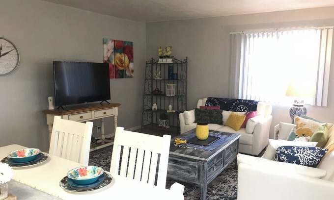 This is a large 1 bedroom private full condo with a kitchen, living room, master bedroom, and bathroom. On site coin operated laundry facility just steps away. Amenities include, assigned covered parking, dedicated high speed WiFi, cable TV, big screen TV, walk in closet, king size bed, and a full kitchen stalked with dishes. We do not allow pets, parties or gatherings of any type. We do not allow loud music, drugs, or consumption of alcohol outdoors. Only those listed on the original booking are allowed inside the condo. Any violation will result in immediate removal from property and lost deposit along with no refund of future dates on reservation.
