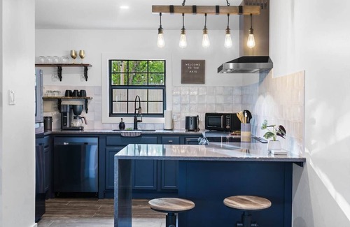 This fully furnished, and newly redesigned 2 bedroom and 1 bath duplex is located on the property with 2 other short term rentals. The Blackbuck, (the sister of The Axis), and The Monarch. You can rent one space or all three!