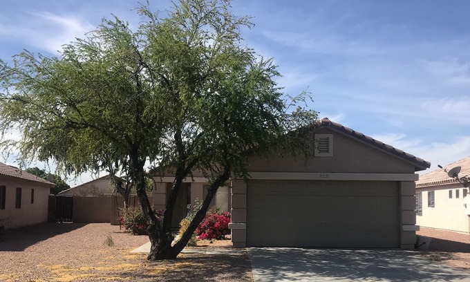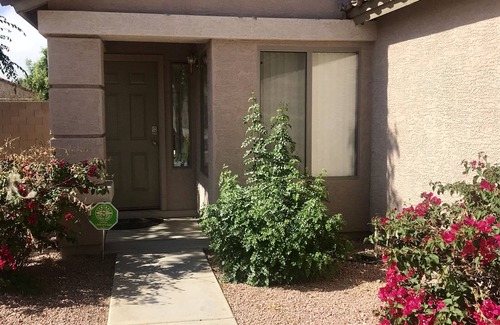Super cute 2bedroom 2bath with a big backyard to enjoy the sun, BBQ at night and use the fire pit too. Walk to Spring Training, KC Royals and Texas Rangers stadium is only one block away! Surprise Tennis and Aquatic Complex is less than 1mile away...features 16 Pickleball Courts (Lighted) and a 5 Acre Urban Fishing Lake with Accessible Dock (fishing license required) a big dog park and so much more is at the complex! We have three community pools, one is only two blocks away. So many golf courses close by too! You will love this location location location!