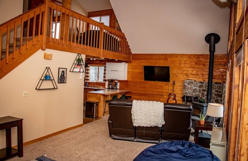 This log home is located on a nice grassed lot with plenty of views of the mountains. As you walk in the home, you'll notice the large windows overlooking the front deck and yard, wood burning stove, wall mount smart TV and plenty of room to stretch out. The kitchen and dining area adjoin the living room and on to the rear deck and yard. The kitchen is well stocked, clean with many nice touches. There is laundry closet just off the kitchen.