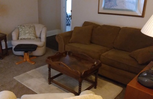 Fully furnished kitchen. Balcony . 950 square feet. Balcony off kitchen off street parking. Very convenient location. Minutes from hockey tournament. Sofa and twin bed for additional sleeping space.
