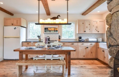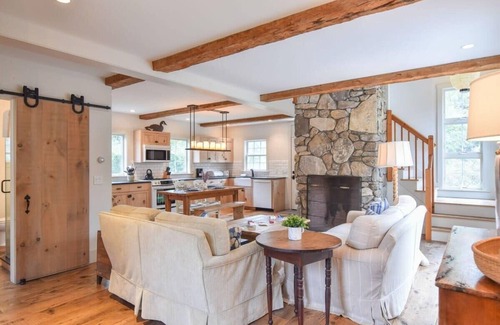 The coastal breeze fills your lungs as you sip your morning coffee, starting your day off the best way the Cape can offer. With privacy, comfort, and decadent decor, come hang ten, at Surf Station. Stepping into this home, you’re greeted by the elegant open-concept living room and kitchen. A stone chimney centerpieces the space, with warm wood and soft colors giving the home a relaxing feel. Barnwood floors and exposed stonework give this home a unique rustic touch, while the modern attention to detail in the home makes you feel like you’re in the schiquest of vacation retreats. Sliding barn doors throughout the home are another fun addition to this home not often seen on the Cape. The primary bedroom, with queen bed and en suite full bathroom, completes the first floor.