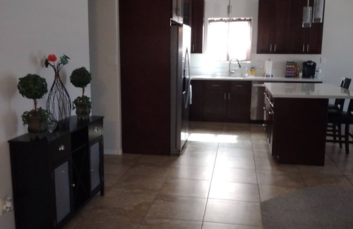Our home away from home has an updated fully stocked kitchen with stainless steel appliances and a classy look. It has an open floor plan with vaulted ceilings. Each room is very spacious and elegant. The backyard has a covered patio, and we've added a firepit as well as a bbq grill.