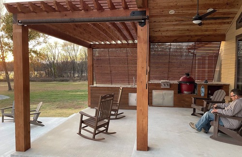 Plenty of parking. Great outdoor kitchen and swim dock. Public boat ramp before you turn into division. Close to Wolf creek for a better boat ramp. Beautiful views. kayak, lily pad, outdoor games like horse shoes, cornhole, crochet, ping pong, provided during peak season. 1 king size bed, 2 queen size beds, 1 full size bed, 1 twin bed. 3 store away beds, pack and play. Dining room seats 10. Great location 1.5 miles from Tom Cat Corner/Cherokee Casino. Perfect place for quiet relaxation. Great porch area. Absolutely no parties. Call or text 9183817661. Please contact owner about pet size. Maximum dog limit is 3. First two dogs are $25 each (one time fee)If more than 2 there will be a fee of $150 for the 3rd pet. Garage is not available for use.