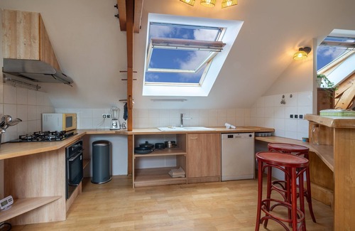 - Open-plan kitchen equipped with dishwasher, fridge, oven, microwave, hob, coffee maker, electric kettle, toaster, extractor fan, etc.