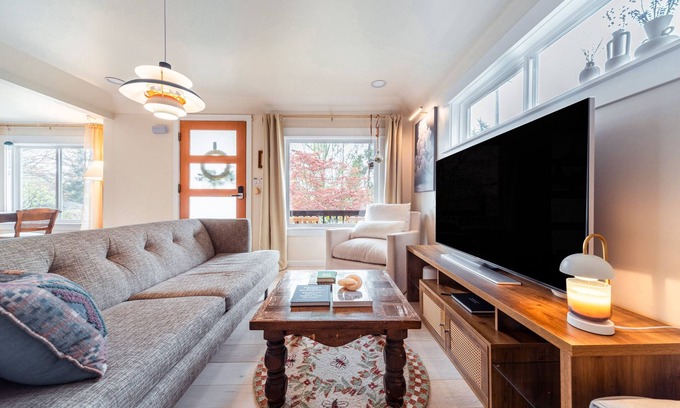 This Cotswold-inspired, nature-surrounded 2 bedroom/ 2 bathrooms bungalow offers cabin vibes with big city amenities. Conveniently located In the charming neighborhood of Maple Leaf, you will have easy access to downtown and other popular destinations within Seattle via I-5, Northgate light rail station, or local buses less than a 5-minute walk away. Downtown, the University of Washington, University Village, Seattle Children, and Green Lake are all 10 minutes away.