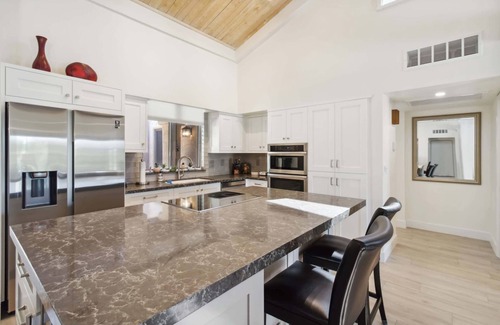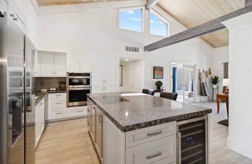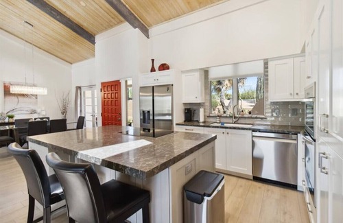 The primary bedroom suite is generously sized, offering direct access to the backyard along with a walk-in closet and a spacious en-suite bathroom that includes dual vanities and a step-in shower. A second bedroom with two queen beds is located on the opposite side of the home for added privacy, making it ideal for hosting guests. A second full bathroom is located nearby and features modern finishes and a combination tub and shower.