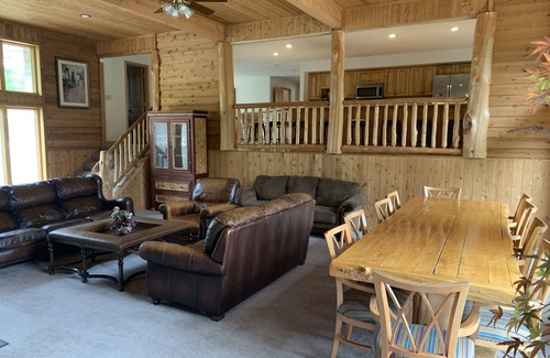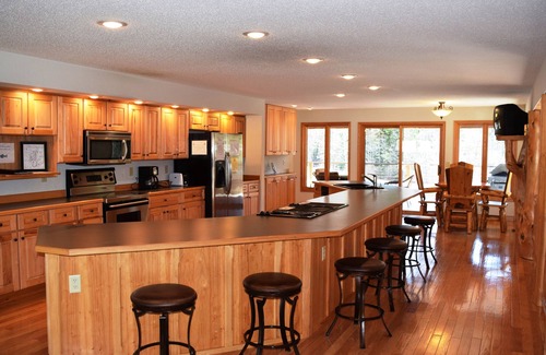 Beautiful Kitchen for Entertaining! Fully Furnished for Cooking - Stainless Steel appliances & Dishwasher. Comfortable Seating at the Large Kitchen Island, A Log Kitchen Table for 4, Dining Table for 10, kitchen island for 12 and Adjacent Outdoor Deck Overlooking the Ponds. The Deck Features Outdoor Seating and a Gas Grill. The Kitchen Overlooks the Dining Area and Large Great Room/Living Room. Get Cozy in front of the Wood Burning Stove while you watch TV and Wifi too!
