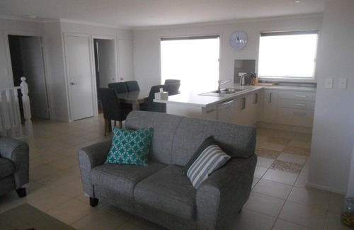 Open plan kitchen with dish washer, fridge/freezer, microwave, living with TV, DVD, dining, reverse cycle air-conditioning.
