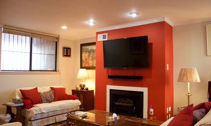 Well-located, fully-equipped 3 storey 1550 sq-ft townhouse with free secure off-street private parking in Center City, close to all amenities, numerous restaurants, shopping (Whole Foods, Starbucks, CVS, Acme etc), parks, teaching hospitals and tourist sites. Very safe and secure. Bus-stops directly outside/1 block away, and metro-underground transportation within 15 minute walk. Ideal for professionals attending meetings and adult families on vacation. No pets and no smoking allowed. Townhouse has 3 floors and basement kitchen/dining R, utility R and powder R. 2 full-sized beds with box springs, spring mattress and mattress toppers, aand ample closet space. Den with double sofa, desk and TV with Roku. Wired ethernet and wireless internet access on all floors. 55 inch flat-screen LED 4K HD TV in living-R, 43 inch in kitchen, all with local channels, Amazon Prime, Hulu and CuriosityStream access. Amazon Echodot with Alexa in living-room. Fully-appointed kitchen with all appliances, utility-R with full-size washer, dryer. Fully self-contained and equipped 'home away from home'. Front and rear-door electronic locks with keyless entry/exit. Private parking with gates. Ring-video doorbell and camera surveillance of entry sites.