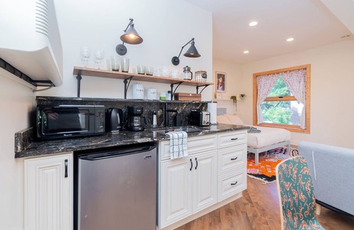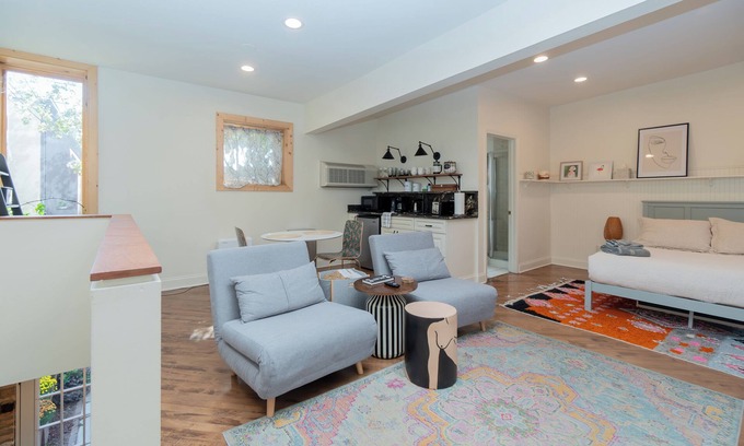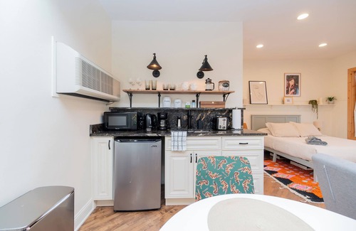 Designed by a renowned New York interior decorator, this stylish studio blends historic charm with modern elegance. Enjoy new wood-trimmed windows, a plush Tuft & Needle queen mattress, Jonathan Adler mugs, Anthropologie lamps, and local artwork that add character to the space. A Marshall Bluetooth speaker sets the mood, making this cozy retreat as inviting as it is sophisticated.