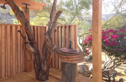 Cat Creek is a unique and historic one-of-a-kind property. Originally a homestead cabin & casita, it's now beautifully remodeled & a perfect place for people who love the romantic 360 degree top view of the desert and mountains, yet 5 minutes from town. You'll love the patio dining views, the exquisite landscaping, the new adorable outdoor shower and complete privacy of this amazing private jewel get-away!