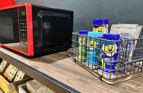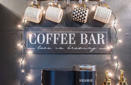 The kitchen comes fully stocked with all typical amenities including a cute coffee bar with flavored syrups, a starter set of K-cups and sweeteners.