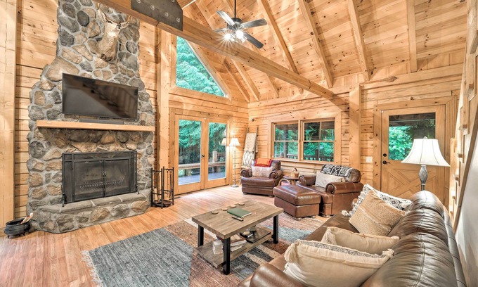 Welcoming Atmosphere: The cabin's inviting ambiance features a wood-burning fireplace and exposed wood beams, creating a warm and romantic setting for you and your guests to enjoy.
