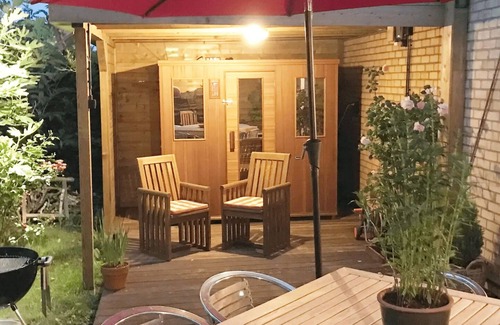 Through sliding window access to the wooden terrace with teak garden furniture and the health mate infrared outdoor sauna for 5 people and a charcoal BBQ from Weber.