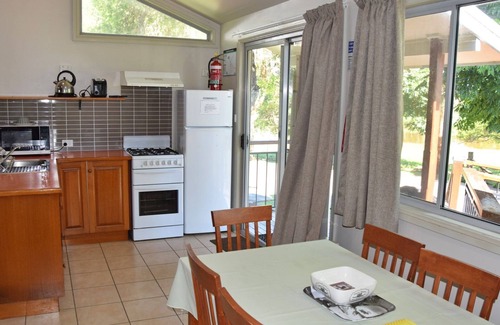 Cabin 6 is a modern self contained cabin with unobstructed views of the Macleay River. Comfortably sleeps 4 people. Complete with own bathroom and fully equipped kitchen with fridge, stove, oven, microwave, toaster, kettle, crockery, cutlery and cooking utensils, the cabin also has a TV, DVD player and Wi-fi.