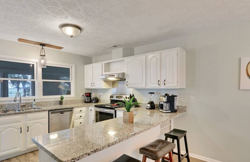 Your stay at this stunning house includes a variety of amenities perfectly suited for both relaxation and celebration. The master bedroom features a king-size bed and en-suite bathroom, while the other three bedrooms offer two queen beds each, accommodating up to 14 guests comfortably. Gather with friends and family in the expansive kitchen or unwind in the sunroom that boasts a slate pool table and breathtaking views. Enjoy outdoor dining on the patio, complete with a grill, or cozy up around the fire pit for intimate evening conversations. With ample seating throughout the home and modern conveniences like ROKU TVs and Wi-Fi, your group will feel right at home.