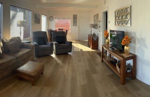 The home has many updates, which include new flooring, remodeled restrooms, and updated furniture. The price reflects the charming home. Great deal!