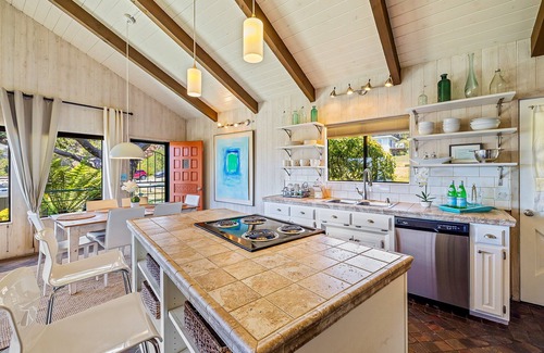 Inside, continue to enjoy tranquil ocean views from the open living room and fully-stocked kitchen. The living room's wood-burning fireplace and plush furnishings lend themselves to cozy nights in, whereas the chef's kitchen makes cooking a breeze with its ample meal prep space and stainless steel appliances. Pair your tasty treats with tropical beverages, prepared outside at the home's private bar, Seacrest Bar.