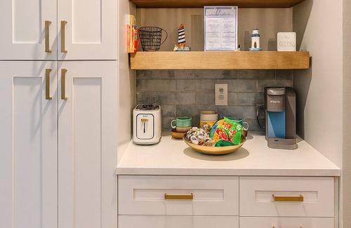 The home offers two comfortable bedrooms: the primary suite with a king bed and private bath, and a guest bedroom with a queen bed. Both are thoughtfully styled with coastal touches and cozy linens to ensure a restful night’s sleep. Two full bathrooms are included, one featuring a luxurious walk-in shower with spa-style fixtures.