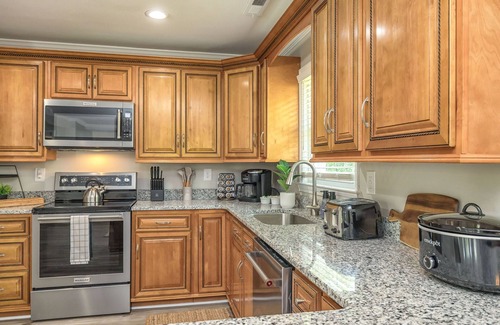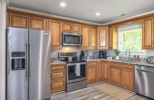 3-bath retreat, a breezy 25 min drive from the beach. Snooze soundly with space for 10, & let the games begin with foosball, air hockey & a myriad of board games. Grill up a storm, dine under the stars, & revel in the fresh vibes of our recent makeover. Your coastal adventure starts here! Premium mattresses, black out shades, smart TVs, high-speed WiFi, Coffee/ Tea Station, Washer/Dryer, & so much more! 20 min drive to Wilmington