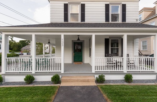 This stunning apartment features new appliances, quartz countertops, hardwood floors, and a smart TV, ensuring your stay is both comfortable and convenient. Enjoy natural light streaming through the windows as you savor a meal at the kitchen nook or unwind with a cup of coffee on the wrap-around porch. With multiple seating areas available, the shared outdoor space allows every guest to enjoy a moment of tranquility while still being part of the collective celebration. Each unit in the building has its own designated parking spot and private entrance, lending an extra layer of privacy and comfort during your stay.