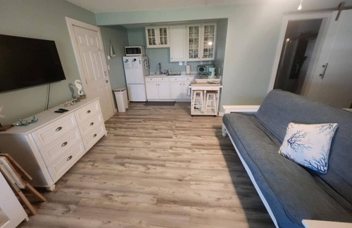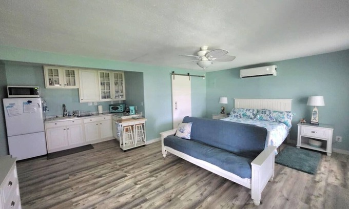 This soundproofed studio is designed for relaxation and flexibility, featuring a private screened-in patio with gorgeous bay views—the perfect spot for morning coffee or evening breezes. Inside, you’ll find a queen bed and your choice of a full-size futon with a comfortable innerspring mattress or a sofa, ideal for couples or small families.