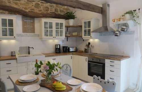 We were very excited about turning the farm's bread oven into a three bedroom gite because the stone breton oven has been perfectly preserved and makes a wonderful feature in the kitchen along with the old oak beams which we highlighted with a spacious vaulted ceiling. We also turned the arched doorway into a bespoke window seat using beautiful carved planks from the original building. The modern kitchen comes equipped with a butler sink, induction hob, dishwasher and oak shelving. The hand painted table and chairs seat five, as do the comfy leather sofas. The living room has a TV, Wifi, DVD plus a supply of books, DVDs and games. There is a wood burning stove with wood provided, and electric heating in winter.