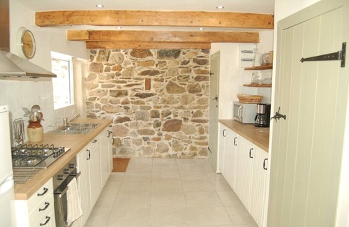 The open plan living space retains its oak beams and stone feature wall. It has a wood burner, electric heating, TV and WIFI, with glass doors overlooking the garden. The kitchen is fully equipped with dishwasher, washing machine, coffee maker, toaster, microwave. The shower room is very spacious and modern. Upstairs the double room has a stone feature wall, wardrobe and dressing table, the twin room has chest of drawers and under eave storage.