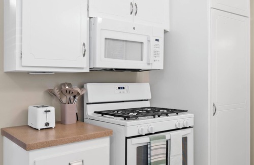 •Fully stocked kitchen with stainless steel appliances, coffee machine, blender, toaster, kettle, and more