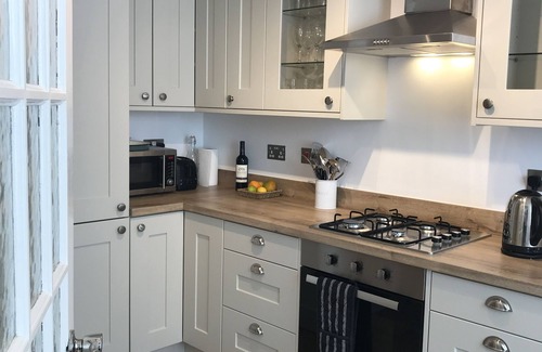 Through the door to the kitchen and dining area, which is well equipped with all new appliances including electric oven and gas hob, fridge-freezer, dishwasher, microwave and washer dryer along with cupboards packed with plenty of pots, pans, crockery & glassware, cutlery & utensils - all that you might need for a short or long stay. There is seating and dining space for up to 4 guests.