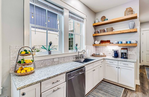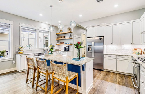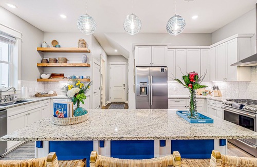 Your wedding party will enjoy an array of impressive amenities at Coastal Happy Ours. The spacious open-concept living area invites you to gather together, featuring high-end décor, a 65-inch smart TV for entertainment, and ample seating for socializing. The chef's kitchen is a culinary paradise, complete with stainless steel appliances, generous counter space, and an inviting dining area that flows seamlessly onto the outdoor patio. Picture yourselves enjoying celebratory meals outside, using the Weber gas grill or picnic table under twinkling string lights for an enchanting evening atmosphere after your festivities.